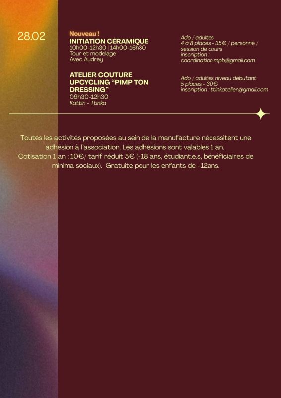 L’espace d’atelier partagé de poterie est destiné à accompagner la filière. Espace avec accès au four (200L, 1320°C), un tour, une boudineuse et une croûteuse, espace de séchage Un espace de travail permanent est proposé avec un loyer mensuel, sur période renouvelable après constitution du demande Un espace de travail temporaire, avec une tarification à l’heure ou au forfait Location de la boudineuse et de la croûteuse afin d’alléger les temps de fabrication et de permettre un recyclage plus aisé de la terre Cuisson des pièces extérieures à l’atelier, (après contrôle) et uniquement avec la terre provenant de l’atelier poterie (partenariat avec un fournisseur local Cerraterre) Espace disponible pour les animateur.ice.s de cours de poterie Espace disponible pour les formateur.ice.s Espace disponible sur demande collective pour des temps de recherche et d’expérimentation. Espace disponible gratuitement avec la contrepartie d’un retour d’expérience(résultats des tests, protocole expérimental et retour formalisé). Dossier étudié au cas par cas.